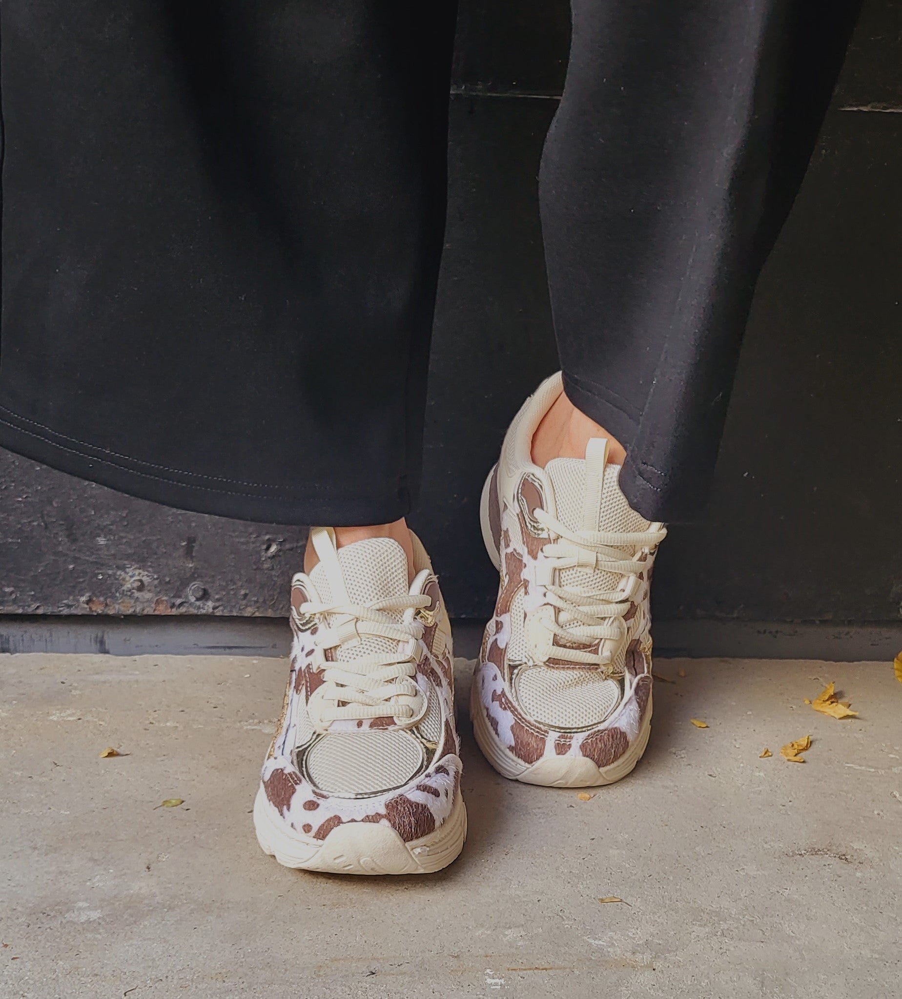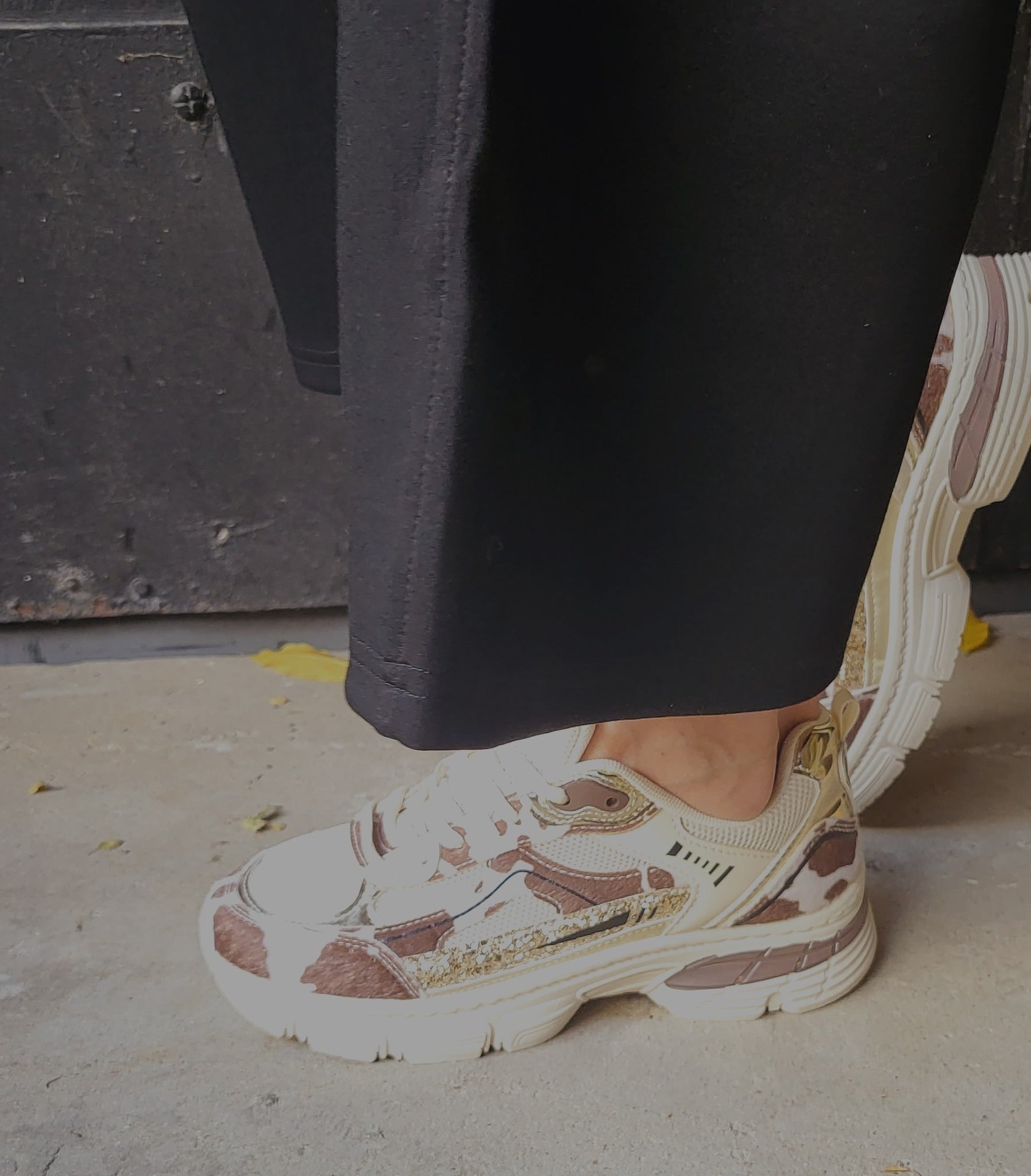 Baskets confort style runing beige avec empiècement vache et sequins dorés sur les côté