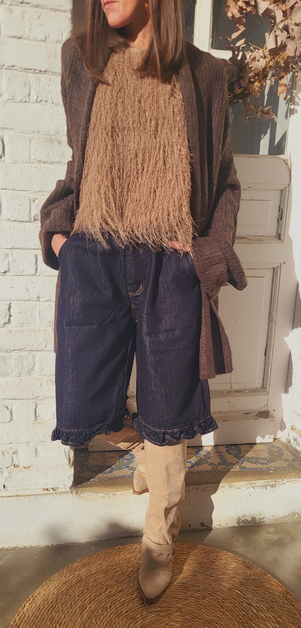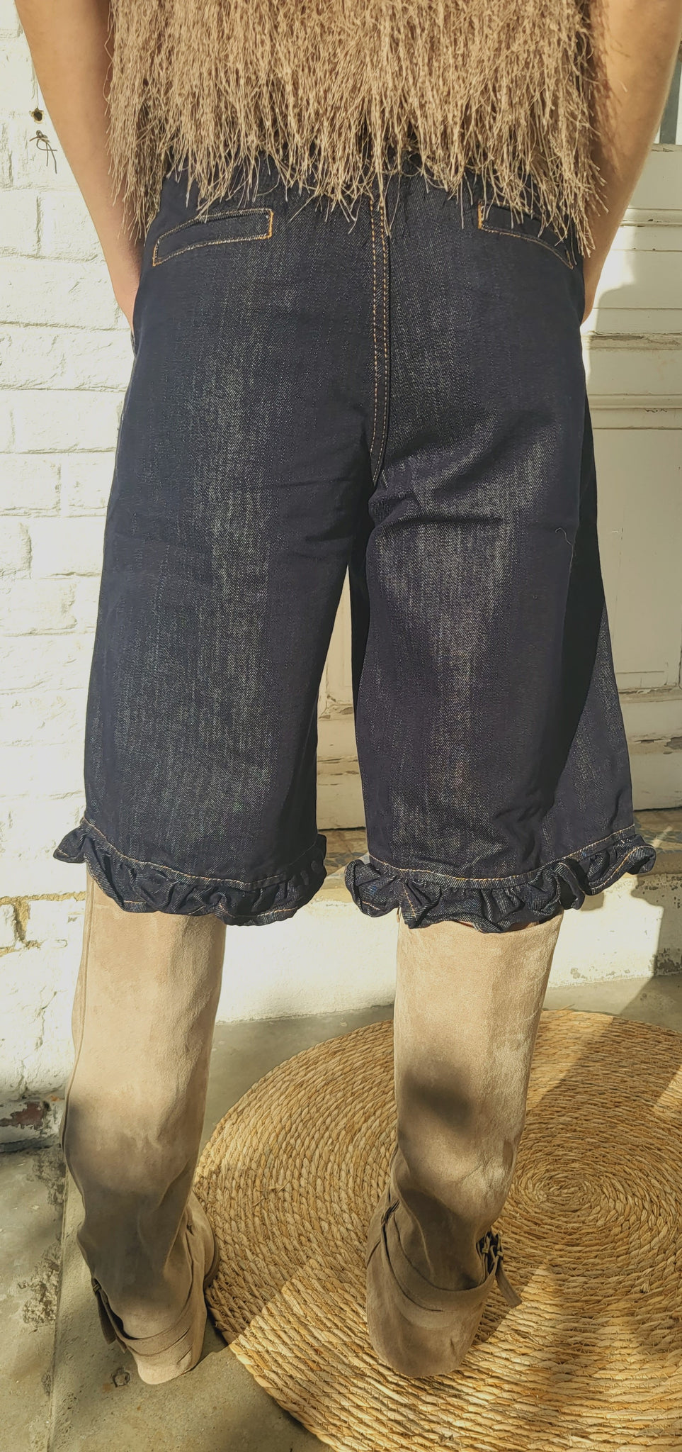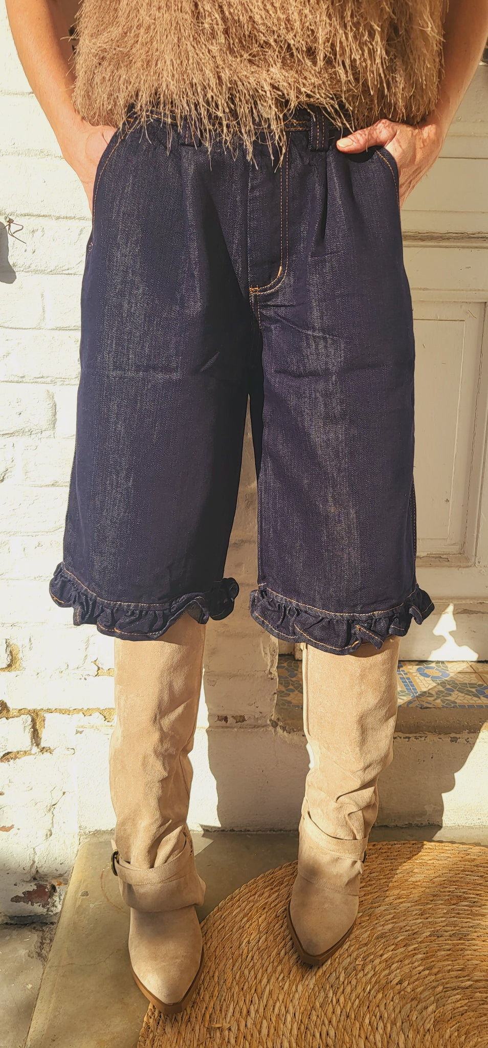 petit volant jean dans le bas, bouton et zip de fermeture, passants