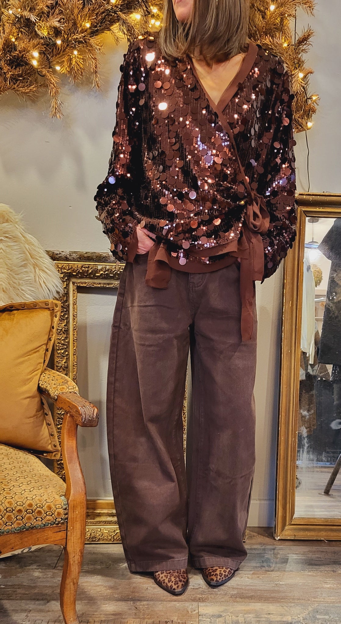 Gilet cache cœur à nouer gros sequins marrons ou noirs