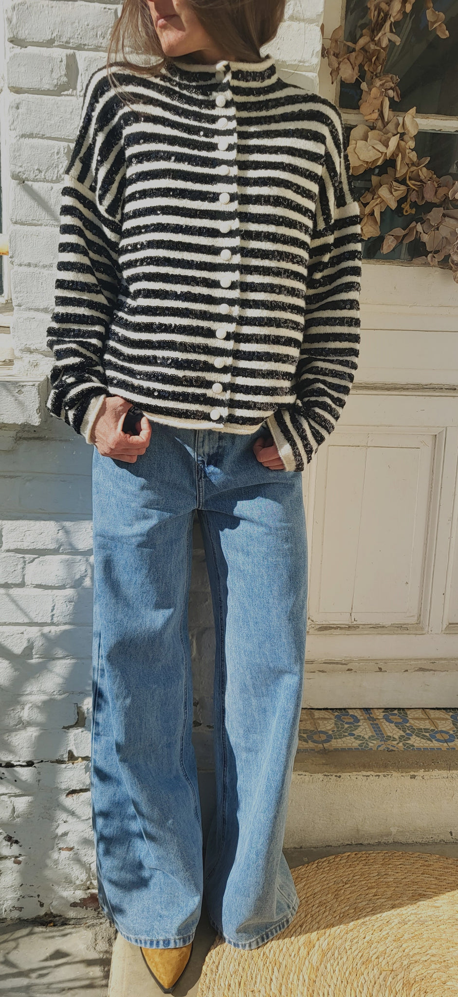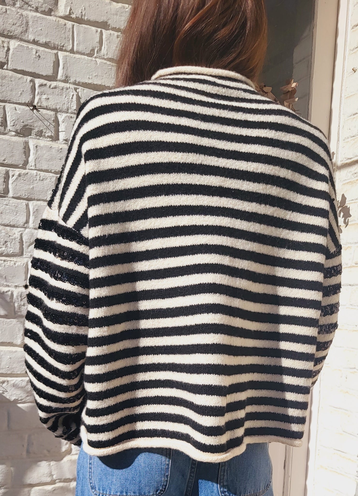 Gilet maille rayé écru et noir, sequins noirs brodés sur la rayure noire sur le devant