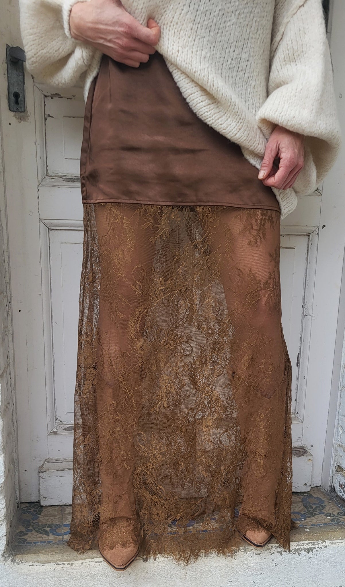 Longue jupe en dentelle chocolat, le haut mi cuisse satiné chocolat