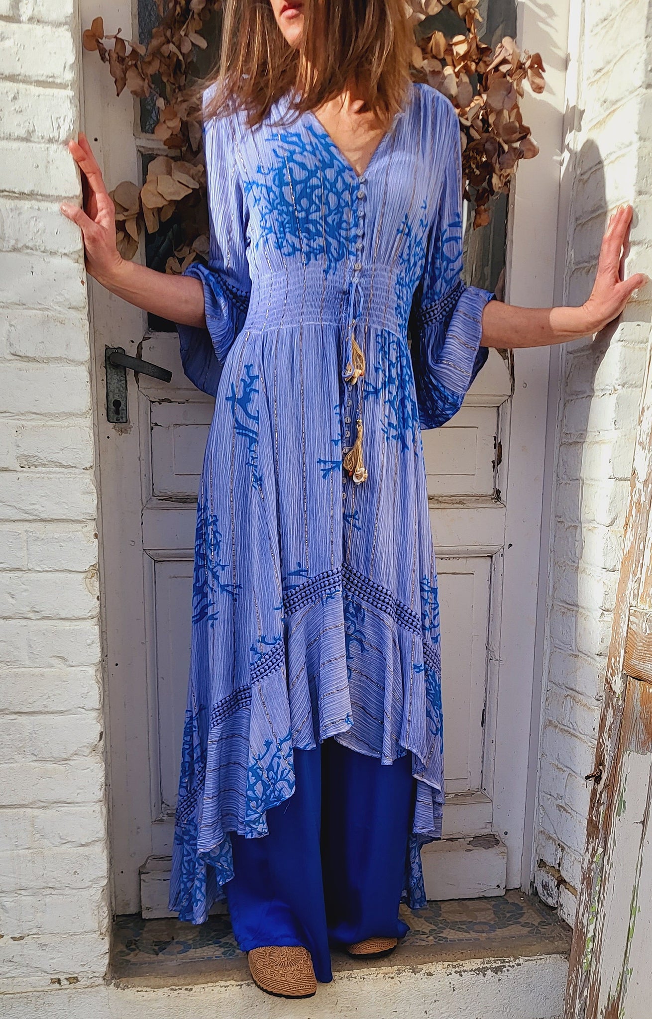 Smockée à la taille, boutonnée sur le devant, cordon coquillage