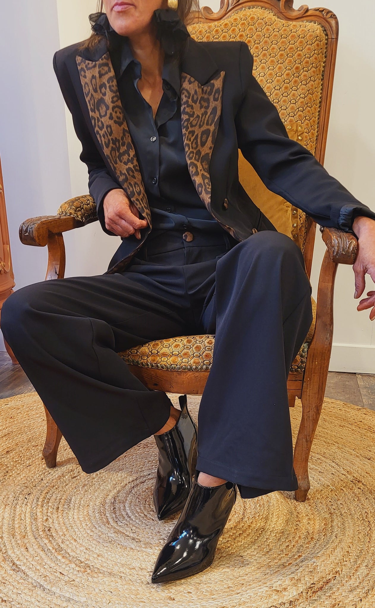 Veste tailleur doublée cintrée très chic avec le revers du col de la veste et les boutons léopard