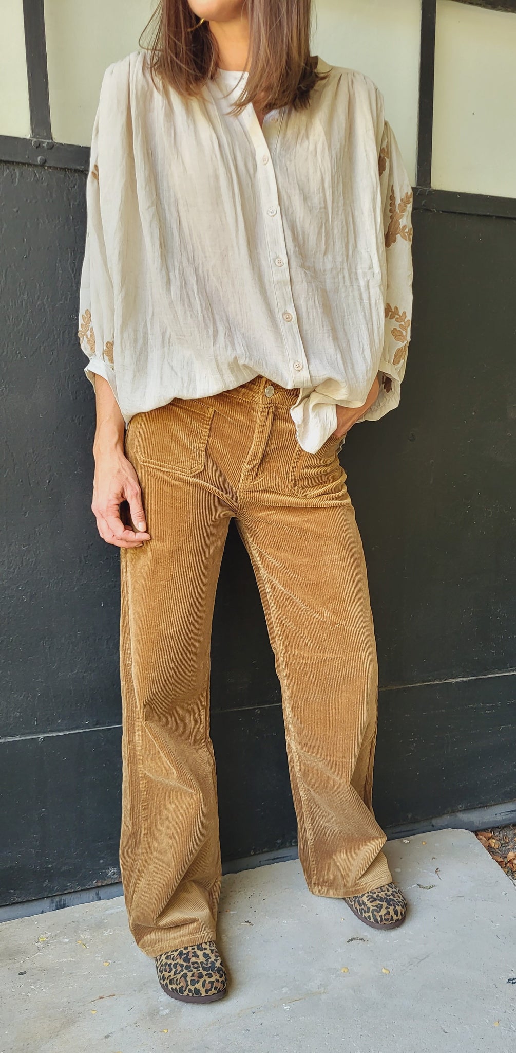 Jambes droite, 2 poches plaquées sur le devant, bouton et zip de fermeture