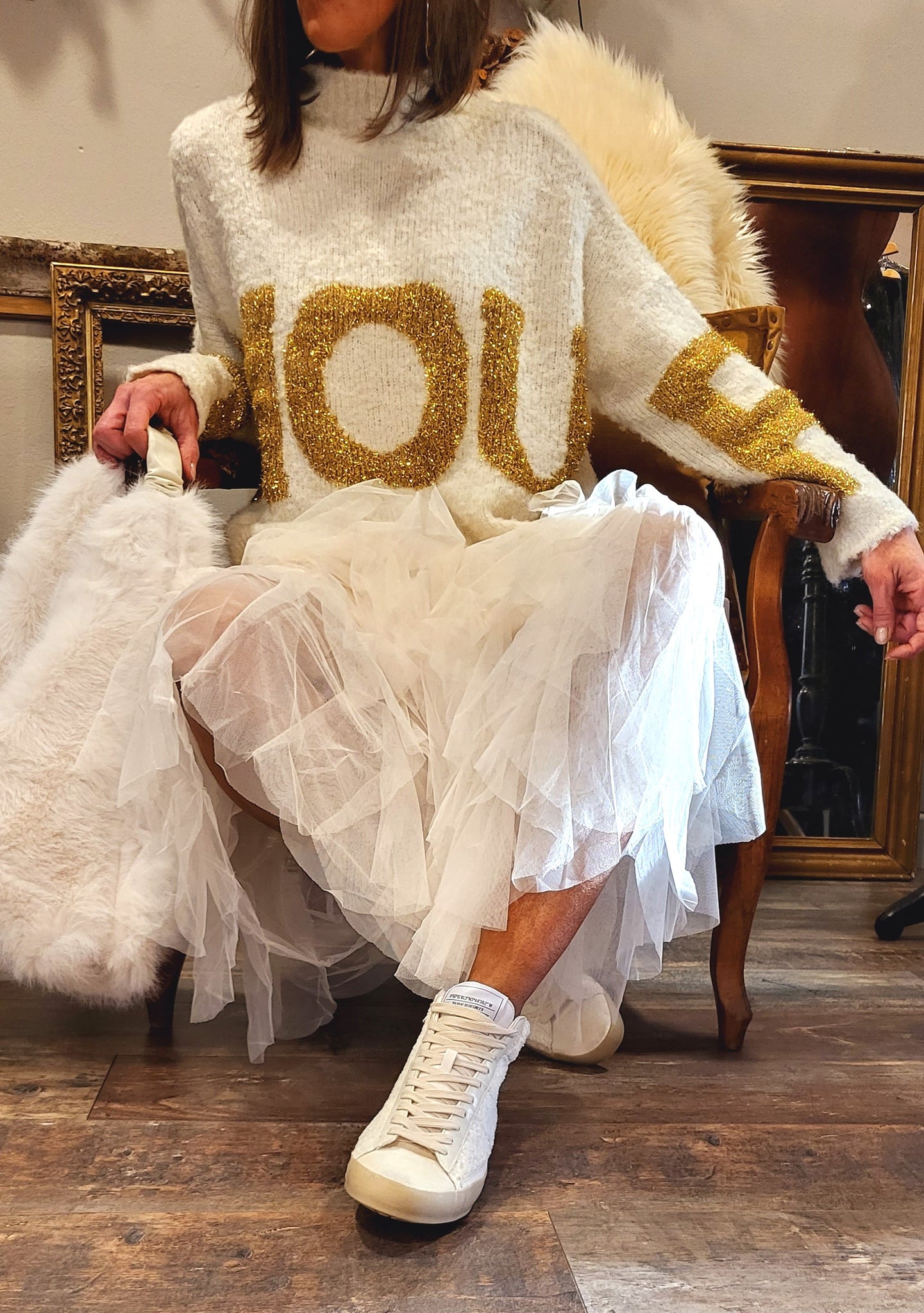 Inscription amour maille dorée sur le devant, forme droite