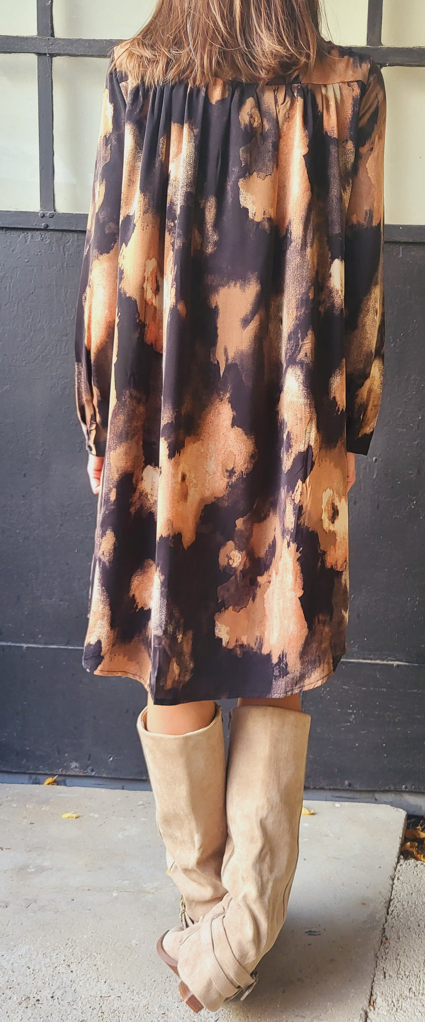 Robe courte forme chemise satinée doublée imprimée ramage  beige noir choco