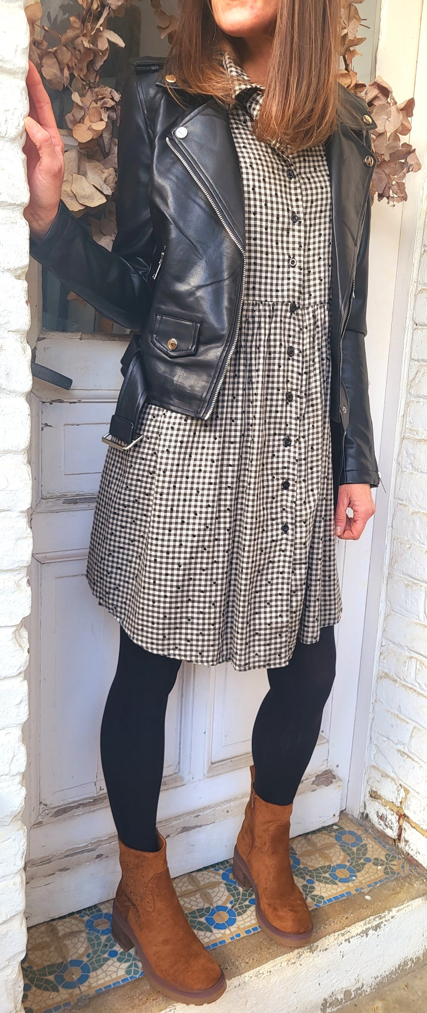 Robe courte doublée forme chemise imprimée vichy noire avec touts petits cœurs noir