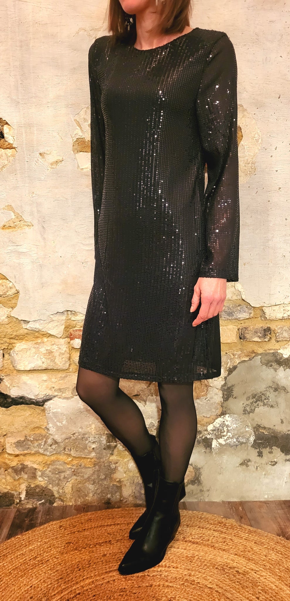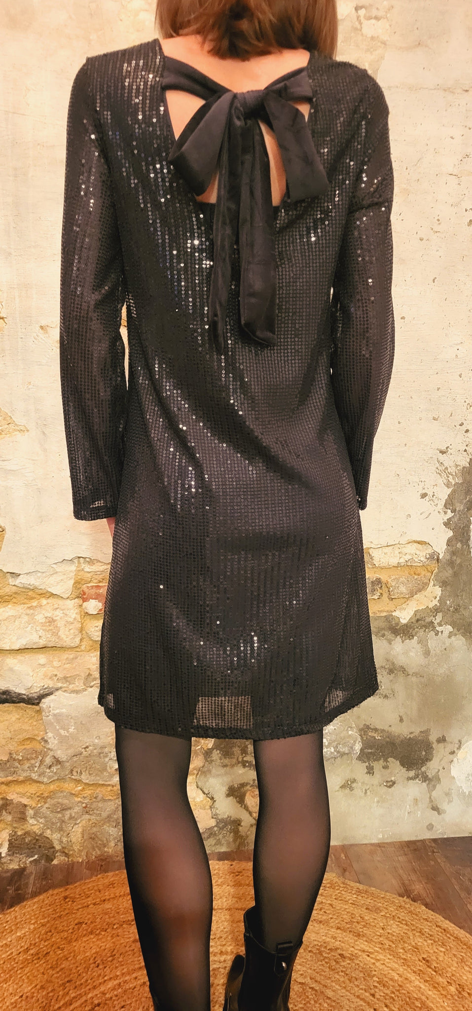 Robe courte fluide doublée toute en petits sequins noirs