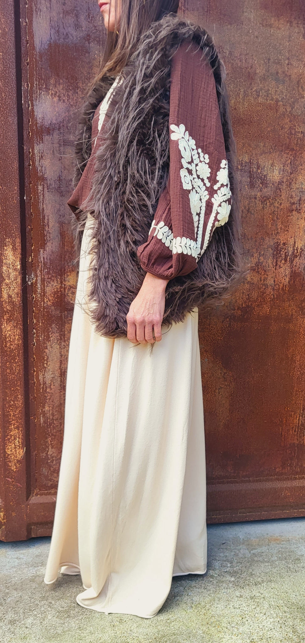 Tunique bohême chocolat avec les broderies écru sur les manches et au niveau du col