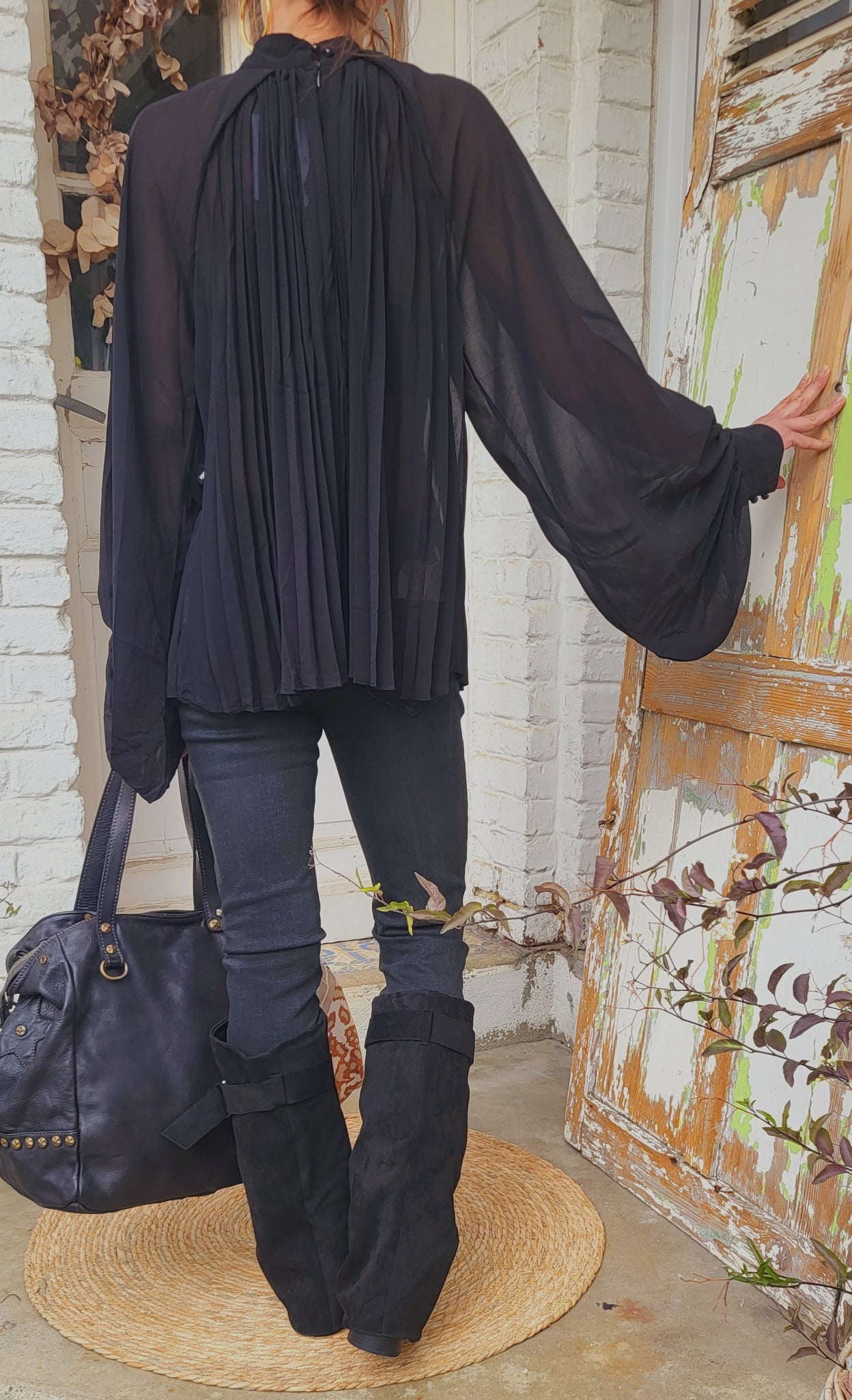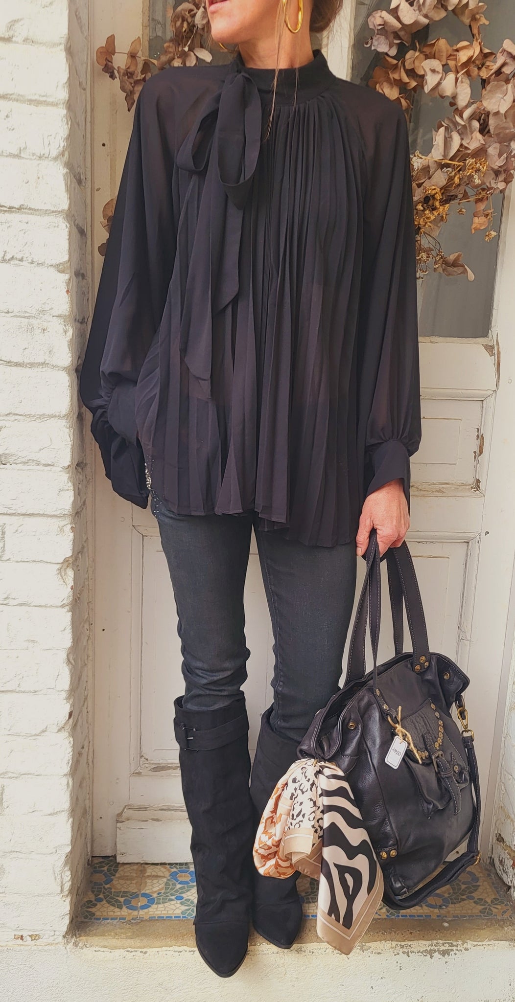 Col mao avec nœud à nouer, manches longues bouffantes dans le bas fermées par 2 petits boutons perles