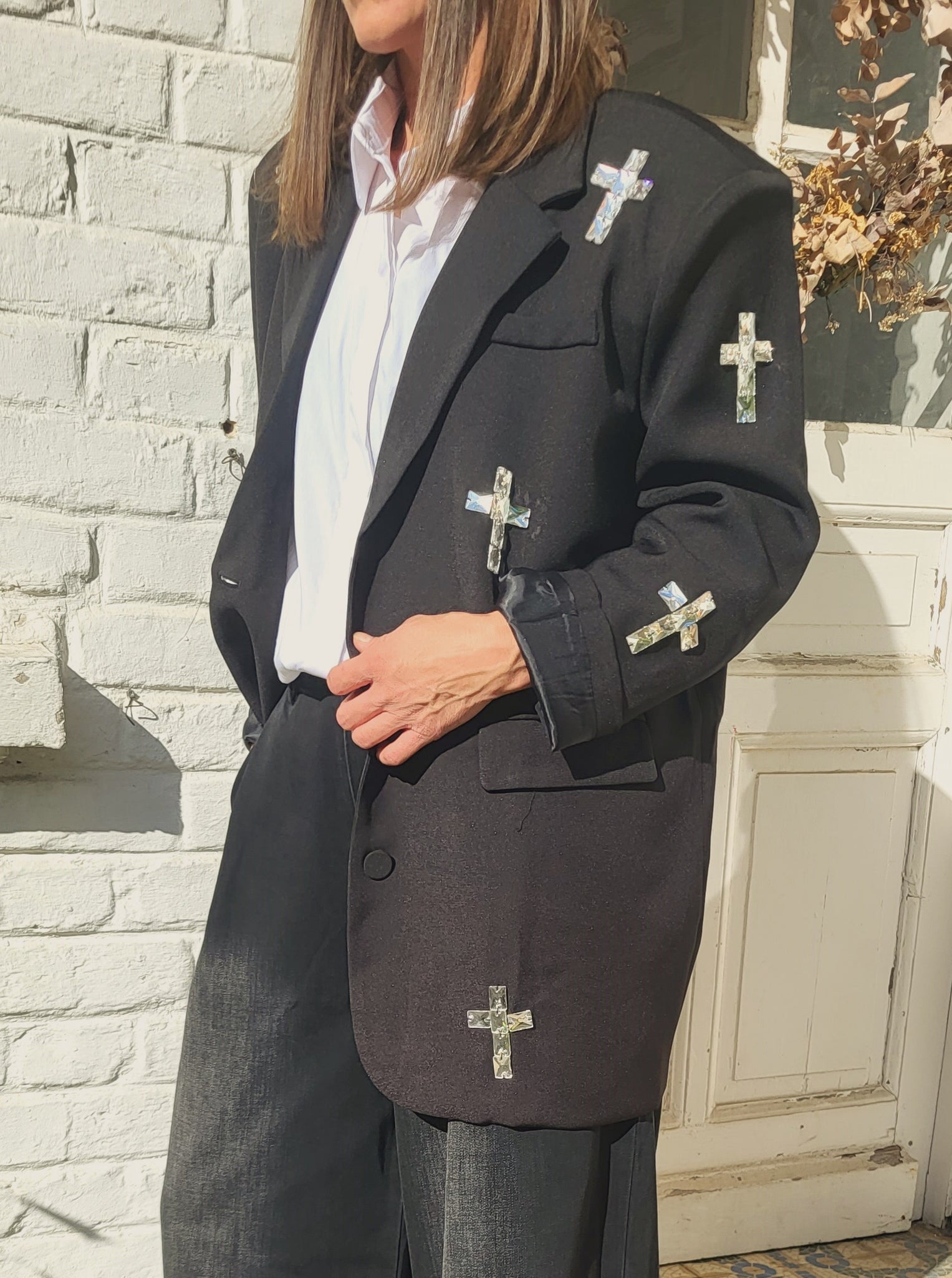 Blazer noir oversize, croix pierre miroir brodées sur le devant