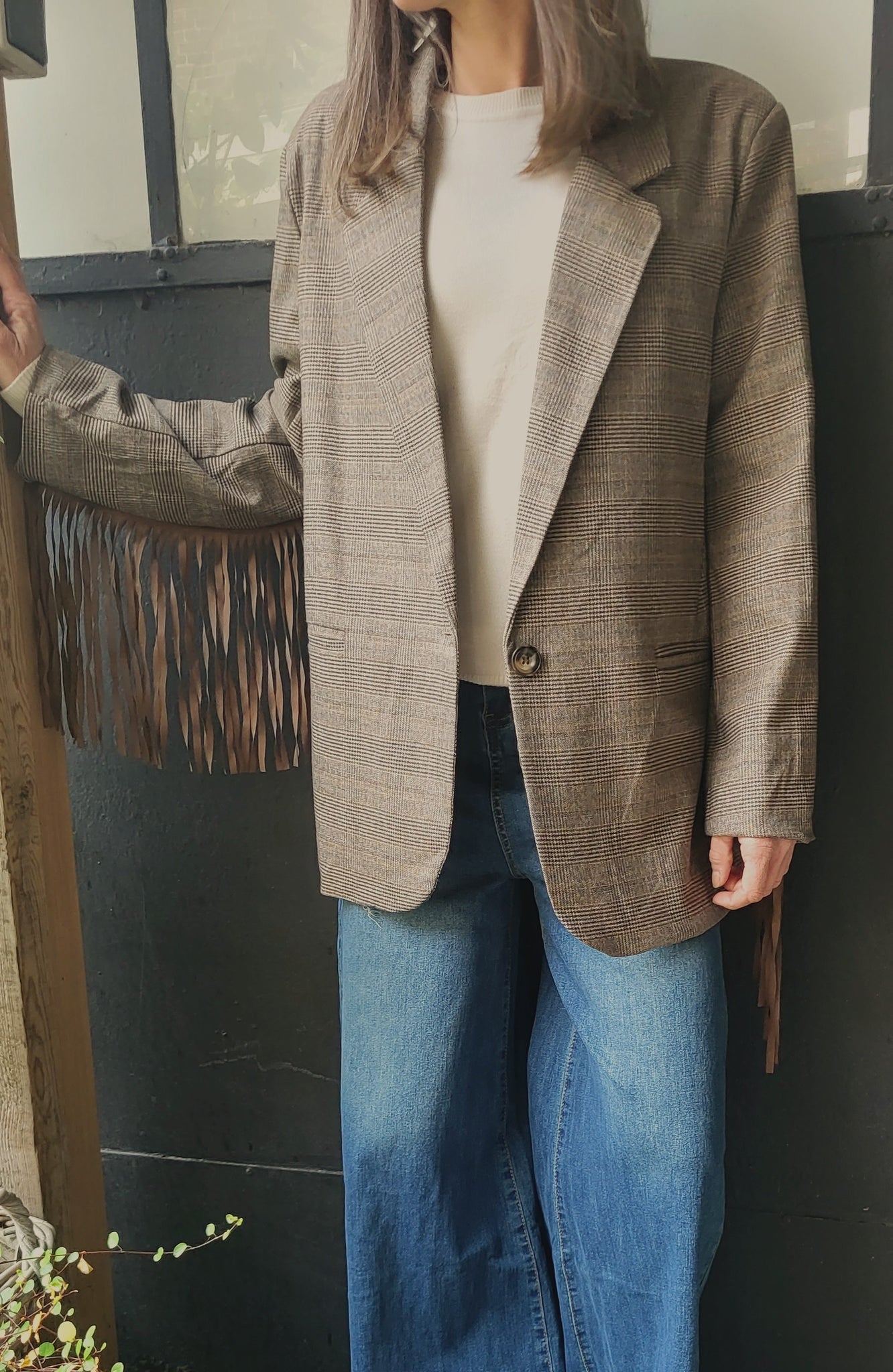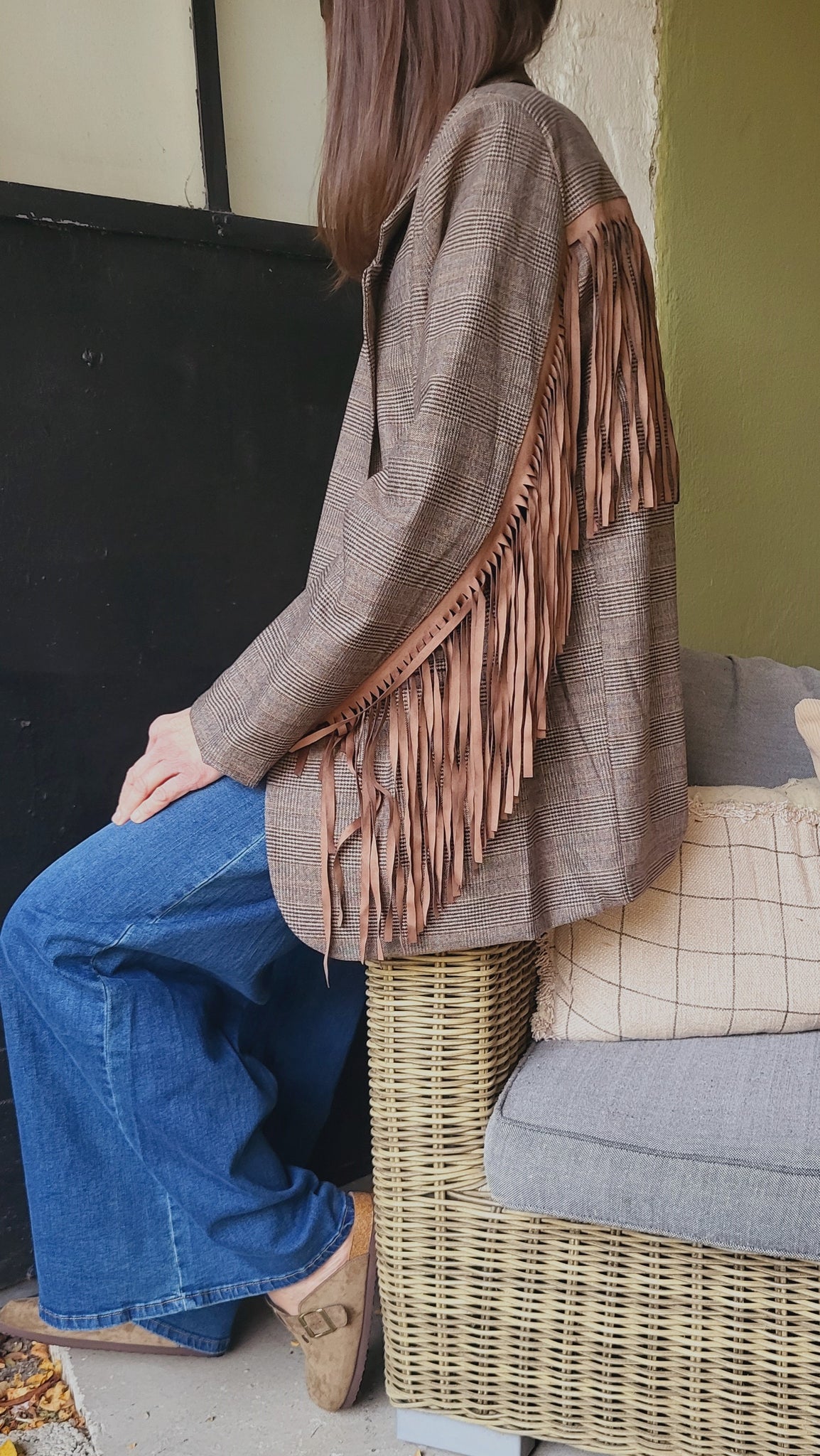 Blazer Prince de Galles doublé franges camel sur l'arrière des manches et au dos