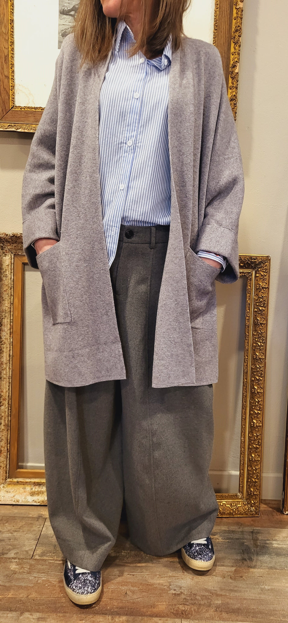 Manches 3/4 rebord, 2 grandes poches sur le devant